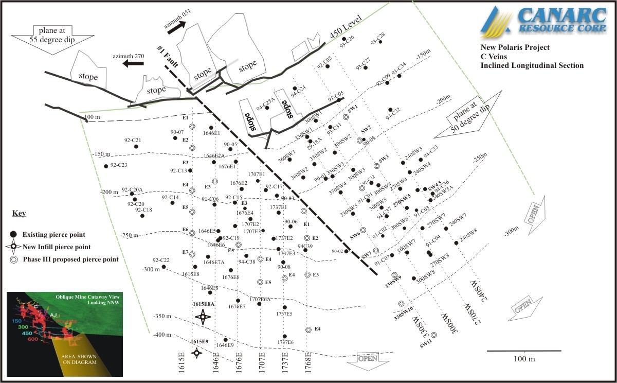 For drill hole locations, refer to the C Veins Longitudinal Section on Canarc�s website - New Polaris Project. All previous drill holes are shown as solid circles, proposed 2006 hole locations are shown as open circles and the hole reported in this news release is shown as a star. Note that this year�s drill hole numbers refer to location along the section lines, not chronological sequence. Therefore, previous drill holes located along the section lines will cause some gaps to appear in this year�s drill hole number sequence.